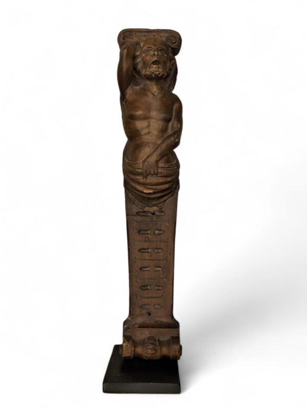 Originally intended as part of a corbel or an architectural woodwork ensemble—perhaps from a monumental fireplace, a grand cabinet, or a wall paneling element—these caryatids served both a structural and decorative function. The term “term” refers to a sculptural figure that merges into a pillar or pilaster form, drawing inspiration from classical antiquity, a motif widely revived during the Renaissance and Baroque periods.