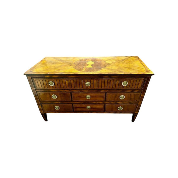 We are delighted to present you with this wonderful Italian chest of drawers originating from the Louis XVI period. Its top displays stunning marquetry that enhances its aesthetic appeal by adding more detailing to its overall design. The piece opens with three long drawers, thoughtfully combining form and function. It has been meticulously restored in our workshop.