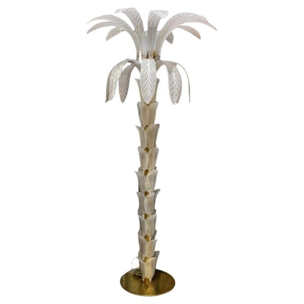 We present you this large floor lamp in the shape of a palm tree in Murano Glass. This lamp’s pieces are entirely detachable and capable of holding up to four bulbs with our recent modifications. The electrical parts have recently been modernised to comply with current electrical norms. We are confident that this exquisite piece would add a stylishly exotic flair to any interior. Murano Glass is renowned worldwide for its exquisite beauty and craftsmanship. It is a type of glass that is made on the Venetian island of Murano, located in the Venetian Lagoon, just off the coast of Venice, Italy. Its dates back to the late 13th century. Glassmaking on the island began as a response to a Venetian law that required all glassmakers to move their foundries to Murano to prevent the risk of fire in Venice. Over the centuries, Murano glassmakers developed unique techniques and styles, including Millefiori (a thousand flowers), filigree, and latticino. They are known for their exquisite glass sculptures, chandeliers, and decorative glassware. Murano glass is highly collectable and sought after by art enthusiasts and collectors. Antique and vintage Murano pieces, as well as contemporary works, are highly regarded.